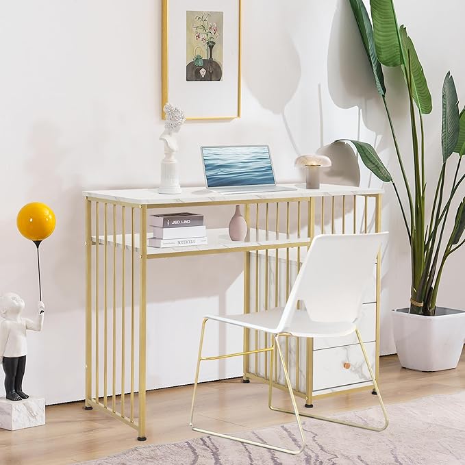 KC Combo Desk with Drawers, Dressing Table, White and Gold Marble, Metal Frame